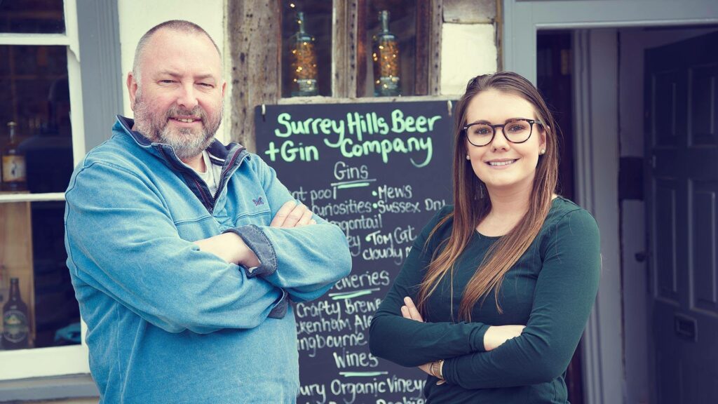 I then went to work for a wine company and studied wine, that was for about 4 years and that’s where the wine knowledge comes into this business, Steve started his sandwich shop 5 years ago and we always kept in touch. The idea came to Steve when someone came to him and said they wanted a bottle of Silent Pool but the distillery was closed, why isn’t there an off licence in Shere? So the seed was sown. Then just through searching on Google for breweries and wine distilleries in The Surrey Hills Steve found it amazing as to just how many there are in this area. This place had been empty for 6 weeks so he put the idea to the landlord who thought it was a good idea and he said, yes, go for it, so he did! We’ve now been open for 18 months, Steve approached me to see if I would like to help out and invest in the business and that happened last April so it’s been nearly a year that we’ve been doing it together. Since then we’ve made it a lot bigger, we go to regular farmers markets, we’ve got ideas to do tastings and have expanded the stock hugely. Our next step is to get online, get bigger, better and more out there! We stock some continental wines, which are sourced locally, every single thing that we sell is local and that is our biggest ethos! We call ourselves a specialist boutique, off licence.”
